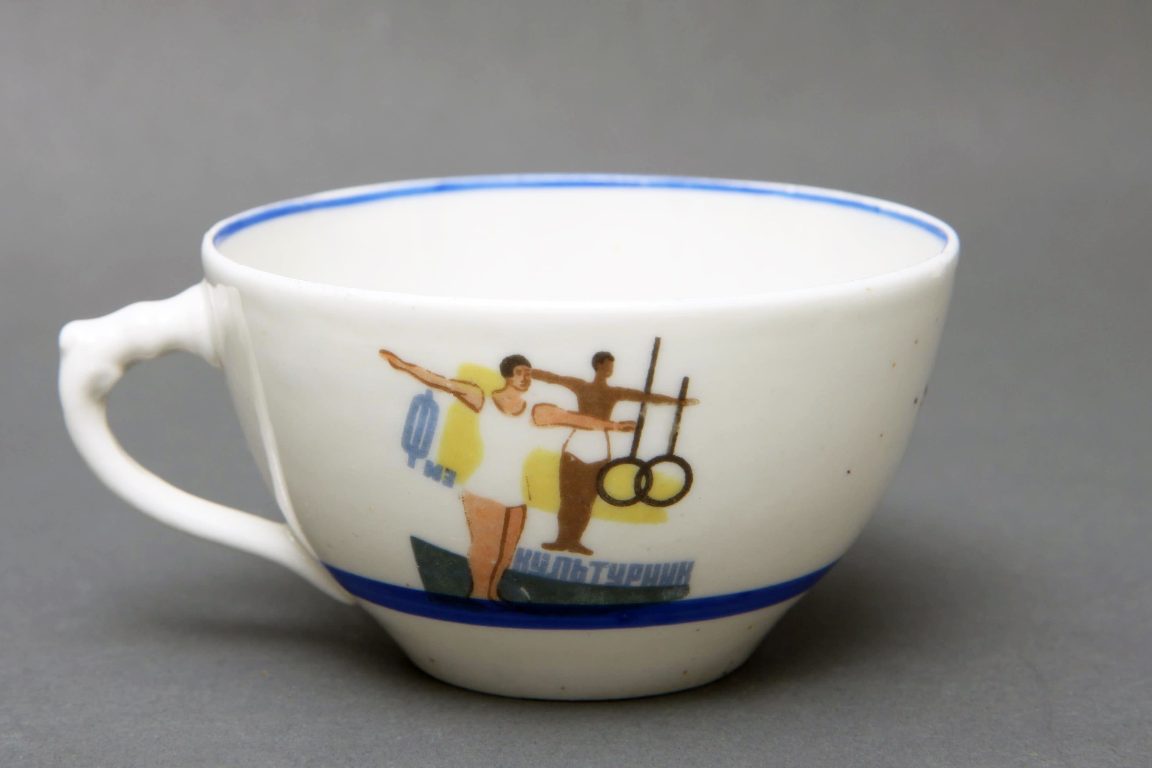 Чашка «Физкультурник – будущий боец». Автор рисунка Н.Н. Пащинская-Максимова, 1930-1932, Государственная Дулевская фарфоровая фабрика им. газеты «Правда»