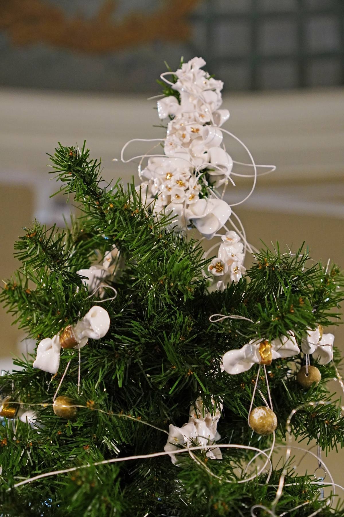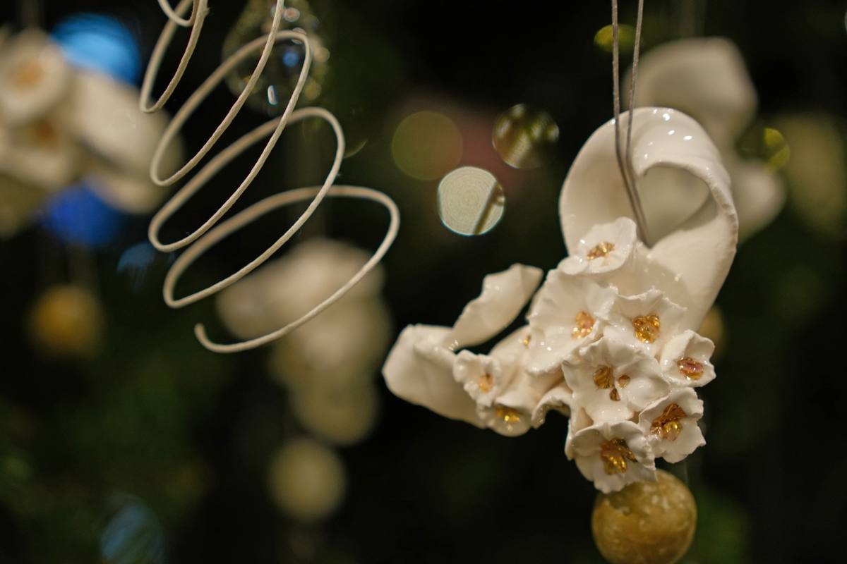 Ёлочные украшения решены в виде бантов разной формы: от скромных с шариком-бусиной до пышных с хрупкими цветами. Все фарфоровые детали изготовлены вручную методом лепки. Глазурованный фарфор и бисквит украшает роспись золотом и краской металлик. Воздушность и легкость убранству добавляют капли-подвесы из прозрачного стекла.